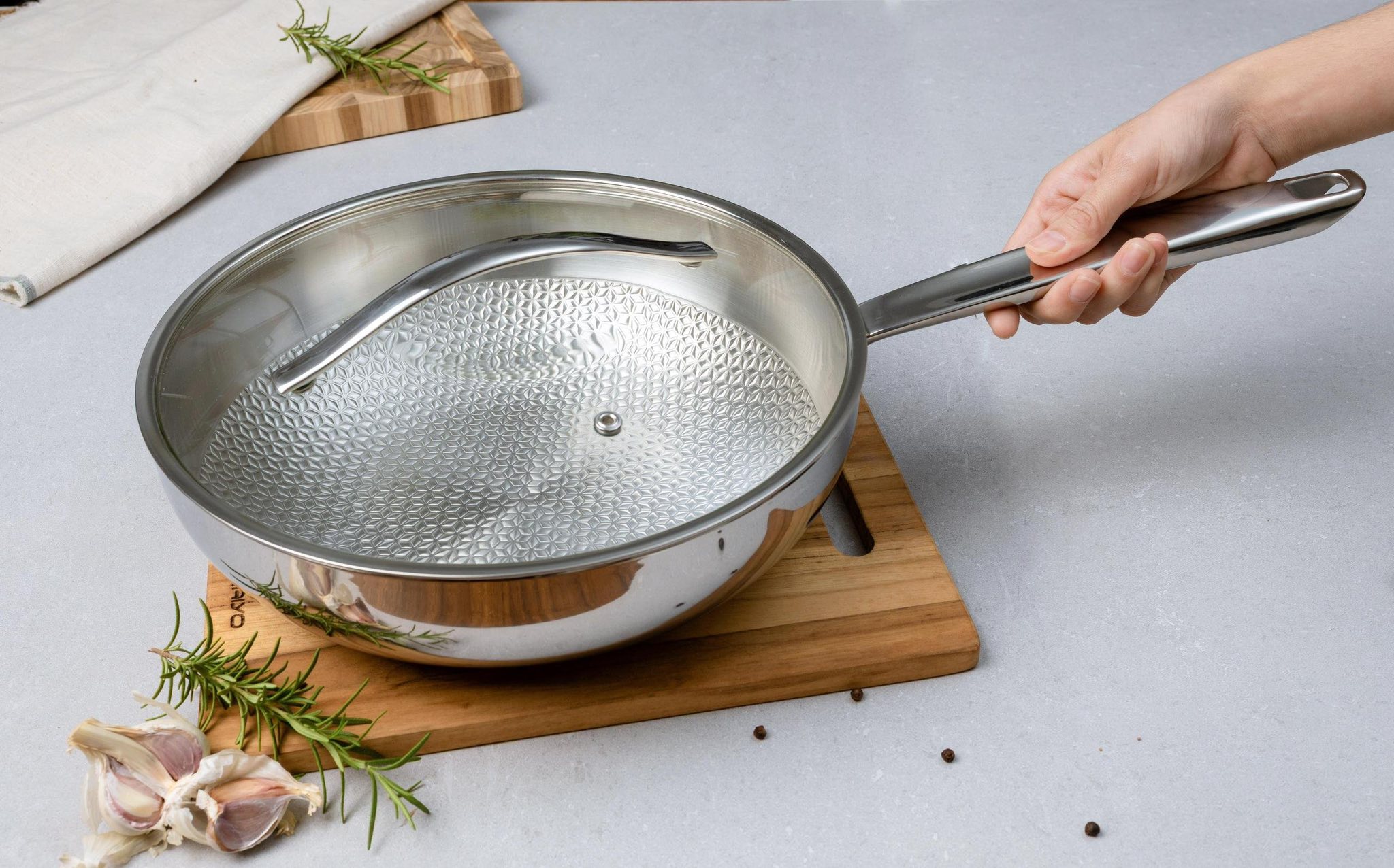 Chảo inox nguyên chất 100%, không phủ chống dính nhưng dùng không hề dính các c nhé! Công nghệ dập nổi bề mặt chảo tạo ra các khe rãnh thoát khí, giúp rán thực phẩm trơn láng hơn hẳn dòng chảo trơn thông thường. Đồng thời giảm bớt lượng dầu mỡ ngấm vào đồ ăn khi chiên rán.