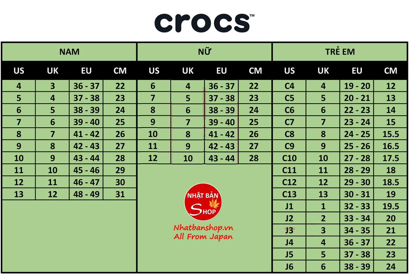 CROCS là thương hiệu giày dép nhựa nổi tiếng thế giới. NHẬT BẢN SHOP xin gửi đến bảng size và hướng dẫn chọn size dép Crocs chính xác nhất.