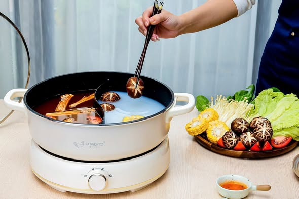 Nồi lẩu Kaiyo size to 6L thoải mái cho gia đình đông người, thiết kế 2 ngăn tiện dụng. Các mẹ có thể chế 2 vị nước lẩu khác nhau hoặc 1 bên cay cho người lớn, 1 bên không cay cho trẻ em. Công suất lớn 1800W sôi rất nhanh, dùng ưng cái bụng cực kỳ ạ!