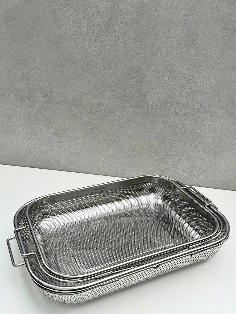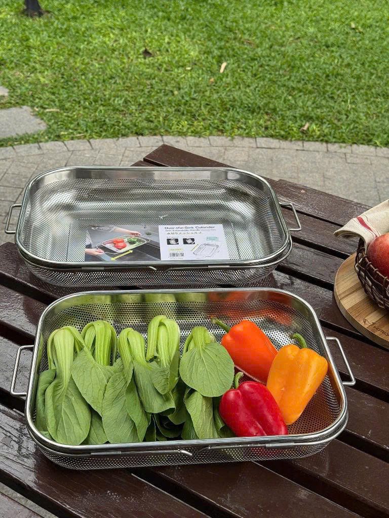 Rửa rau, củ, quả xong đặt rổ ngang bồn rửa luôn cho róc nước quá tiện lợi ạ! Hàng Kaiyo xịn sò dạng inox nguyên tấm đục lỗ “punching hole” siêu bền, không phải mấy loại rổ bằng sợi lưới đan nhanh bong đâu ạ!